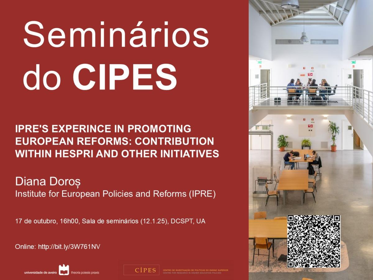 16h00 – Seminários do CIPES – “IPRE's Experience in Promoting European Reforms: Contribution Within HESPRI and Other Initiatives”, Diana Doroș.